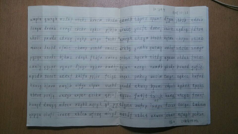 回帖:今天又练了三次听抄,速度20WPM,有一次做到了100组只丢两个码。因为本子上剩下一张单页纸,所以我先练了一次66组的,正确率是99.1%,算是热热身。然后练两次132组,正确率分别是98.3%和99.4%。其中最后那次是分别在第60组和第117组各掉了两个码。也就是说如果只算前100组的话,就只掉两个码。