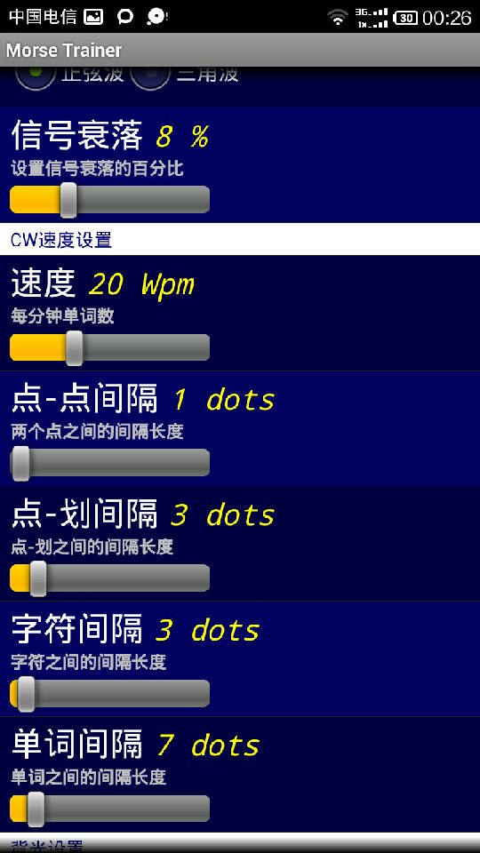 回帖:很抱歉地告诉大家,之前我有一件事搞错了。前几天练习的时候,我都是设置字符之间的间隔是5个点的。这是不标准的,比较宽松的设置。可能是以前我练习听高速的时候,把间隔改成了5点,后来忘记调回来了。今天在琢磨速度与时长的时候,我想起去看看设置,才发现。