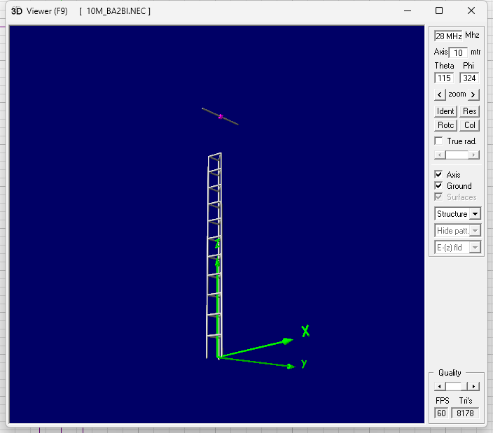 简单的建立了一个模型 10m 水平偶极子 高度 27m三角铁塔高度24m 铁塔边长0.6m 最后一张图是删除了铁塔就出现微小的变化。