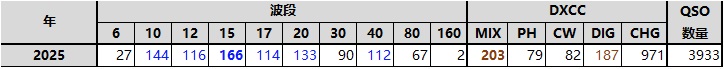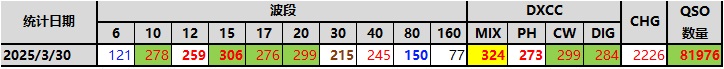 回帖:2025年3月,虽然气温忽上忽下,但DX意义上的春天还是如期而至,本月QSO数量超过900,其中300左右是RDXC和WPX SSB比赛打酱油时做的,工作还是那么忙,这两次比赛都没有时间参加,第一季度的三个月完成了203个DXCC,和去年保持一致,可惜ATNO HK0A和HJ4ADR/0都没有收到,他们条件比较差,而且SSB为主,这个每年都出现的DXCC以后还有很多机会的。