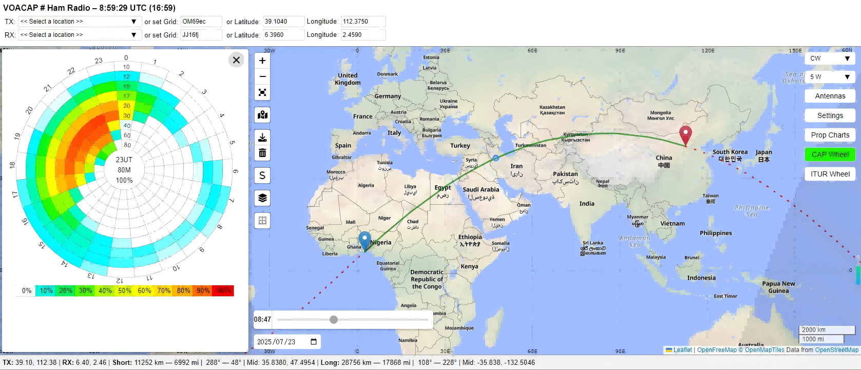 7月份和4月份相比传播是有差异的,北半球夏季夜间14兆至21兆的转播明显好于白天,反之南半球处于冬季,白天高波段的传播明显好于北半球。通过多日观察,发现TY5FR的信号多集中在14兆至21兆。当地时间日落时分,就可以在spot上看到他在21兆呼叫eu,有时也会在24兆呼叫。接近午夜0点左右,也是对方日落灰线时间,开始可以守听到对方21兆至14兆的信号。