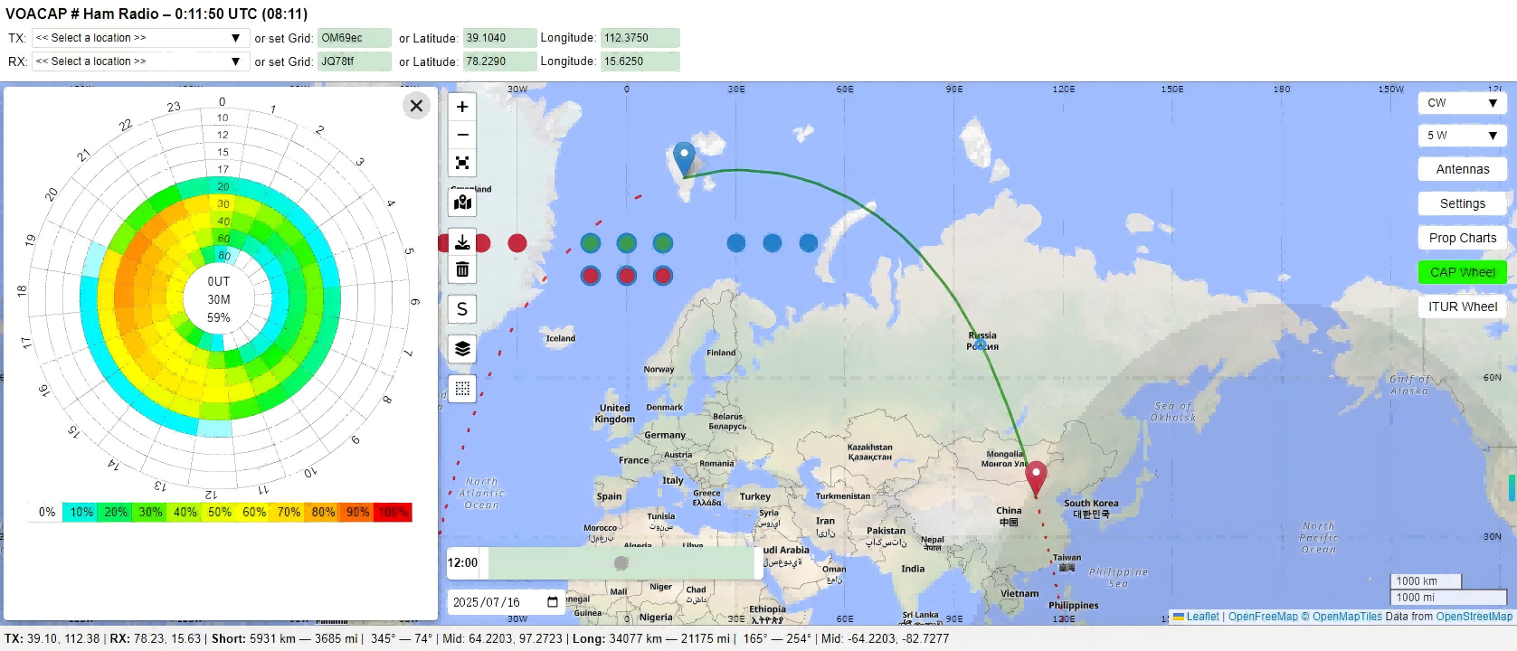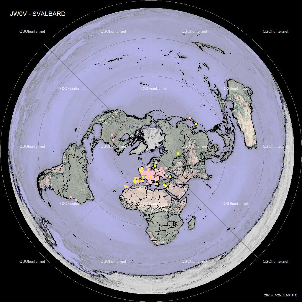 和以往追逐DXCC不同,此次斯瓦尔巴群岛位于北极圈内,同时7月份是北半球的夏季,北极处于极昼,北极终日太阳不落,所以给人的感觉就是JW0V位于圆圈中心,转着圈与日本、欧洲及北美洲几个业余无线电爱好者集中的国家地区进行通联。所以每次和日本及国内通联时都可以很好的发挥灰线优势,通联时间基本固定,信号也非常好。
