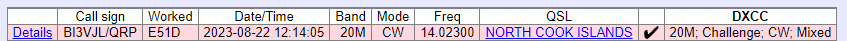 2023年8月份,在BA6QH七公阮老师的指导下,我第一次异频操作,主动追逐大洋洲北库克群岛DXCC——E51D的的信号并通联成功,自此也正式开启了我的DXCC追逐之旅!