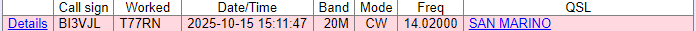 10月15日晚上的23点11分,我遇到了T77RN。起初我并不知道T7是哪个DXCC,只知道其显示红色,我没有通联过,同时其位于欧洲,加紧切换天线到欧洲方向,后面的通联过程就是顺其自然,在其通联结束的间隙,第一时间发送了自己的呼号(20WPM),并立即得到了“BI”的回应,之后就是几次呼号拍发及对方599的信号报告,睡觉前查询QRZ主页才知道自己通联到了圣马力诺。目前仅收到了QRZ的确认,后面需要追卡了