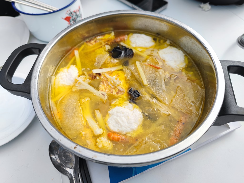 三鲜土鸡汤(配料:土鸡、花菜、西蓝花、鱼丸、河虾、炸猪皮、猪肚片、木耳、河虾)