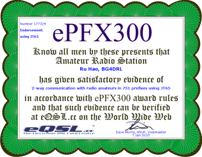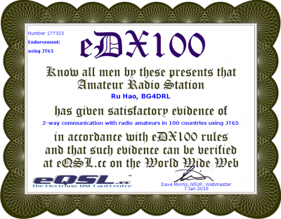 The eDX100 JT65 Award for BG4DRL was APPROVED!