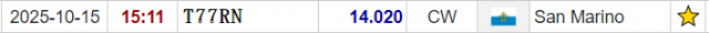 10月15日晚上的23点11分,我遇到了T77RN。起初我并不知道T7是哪个DXCC,只知道其显示红色,我没有通联过,同时其位于欧洲,加紧切换天线到欧洲方向,后面的通联过程就是顺其自然,在其通联结束的间隙,第一时间发送了自己的呼号(20WPM),并立即得到了“BI”的回应,之后就是几次呼号拍发及对方599的信号报告,睡觉前查询QRZ主页才知道自己通联到了圣马力诺。目前仅收到了QRZ的确认,后面需要追卡了