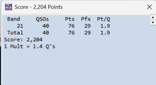 (一篇类似于闲聊的比赛总结)这次是为数不多,使用 BI1TMQ 作为使用呼号参加的竞赛,上次还是没看结束时间,只完成一个 QSO 的 RDA。这周末有 WAPC 的 CW 竞赛,但是由于对报不太感冒,加上听抄的能力有限,就选择了与 WAPC 时间完全重合的 OC DX SSB 比赛。这是一个相对小众的比赛,BY 参加的人并不算多,虽然只能通联 OC 台,但是 VK,YB,DU 的电台并不少。由于通州基地周六没有人在,所以我只能在周日的中午开始,在剩下的两个小时时间捡一个尾巴。国庆期间的传播并不好,所以我选择了比较稳妥的 15m 来打 single band,时间不多所以优先扫街,将大台通完过后就进入到了痛苦的拉扯阶段。经常出现的就是我听得见他,他听不见我,呼号得重复很多次对方才能抄对,tango 被听成 echo,换成 Tokyo 被听成 hotel,也可能和我的呼号没怎么打过比赛,所以没有出现在 N1MM 的呼号 check 里有关系。赛后和其他北京的友台交流了一下,反应说第一天下午的 15m 传播还不错,但是第二天的传播不是很好。最后在两个小时的时间里共计完成了 40 QSOs(其中有两个不看规则的 JA 电台来通联我,non-OC 和 non-OC 通联是没有分数的),prefix 29 个,共计 2204 分