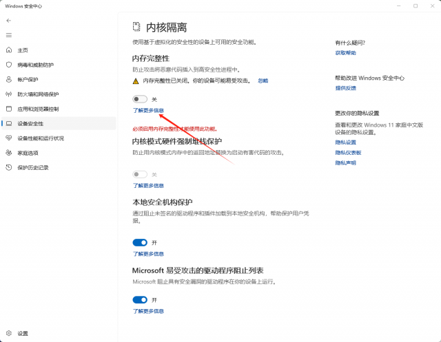 根据提示找到问题,要把这个内存完整性关掉,这样没有经过微软认证的驱动才会顺利得以安装。